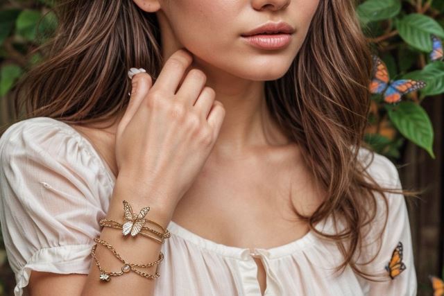 - Collares en capas: Múltiples cadenas de diferentes longitudes con colgantes de mariposa, perfectas para crear una apariencia elegante en capas.