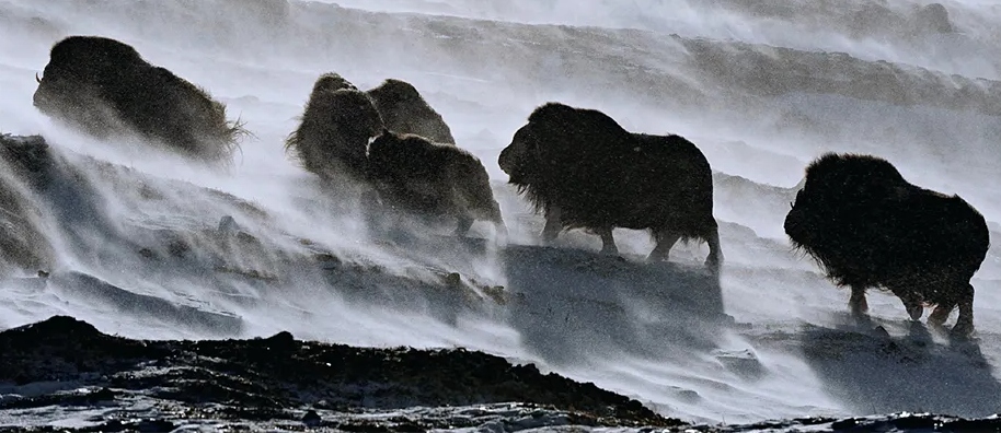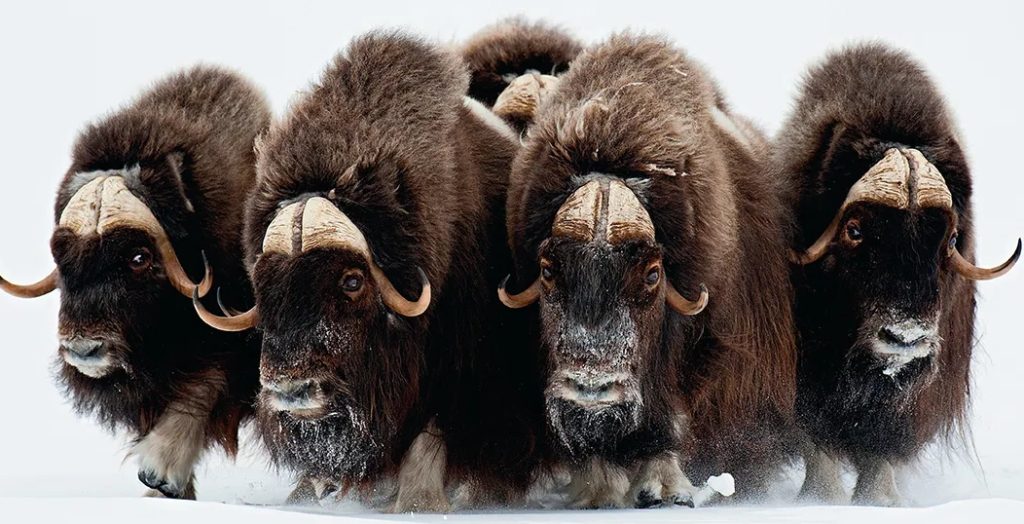 Más al interior, en las vastas planicies heladas, un grupo de bueyes almizcleros (Muskox) se mantiene unido. Su espeso pelaje los protege de temperaturas extremas, y su estrategia es simple pero efectiva: permanecer juntos frente a cualquier amenaza. Son sobrevivientes de otra era, reliquias vivientes de la Edad de Hielo.