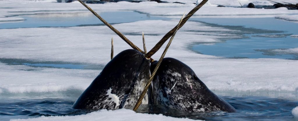 El Unicornio del Ártico: El narval surca las grietas del hielo marino. Su colmillo helicoidal atraviesa el agua como una lanza de marfil, un enigma que ha alimentado leyendas durante siglos.