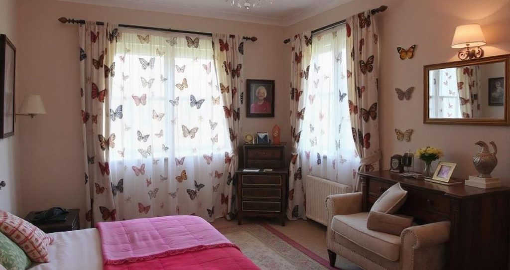 - Accesorios: Complemente sus cortinas de mariposas con accesorios a juego, como cojines, alfombras o arte de pared para crear un tema cohesivo en la habitación.