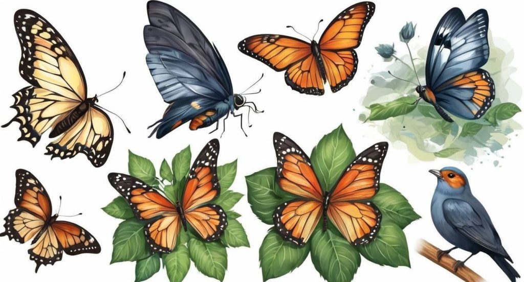 Las mariposas simbolizan la transformación, la libertad y la belleza. Sus delicadas alas y colores vibrantes los convierten en un tema popular en el arte y el diseño, ya que representan la naturaleza fugaz pero hermosa de la vida.
