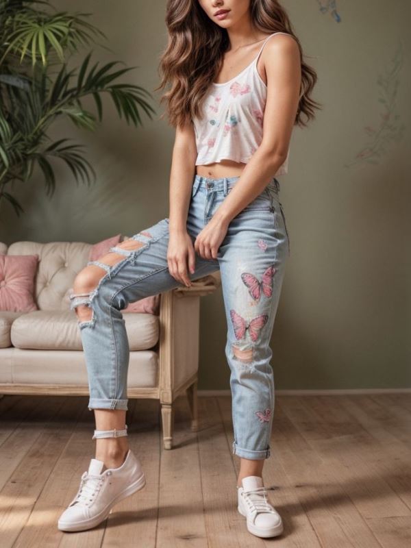 - Estilos desgastados y con parches: La combinación de motivos de mariposas con jeans desgastados o con parches crea una apariencia moderna y atrevida. El contraste entre las delicadas mariposas y el denim resistente añade interés visual y profundidad al diseño.