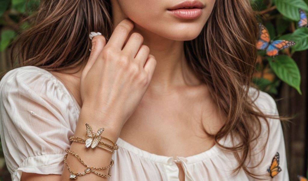 - Pulseras de Cadena: Delicadas cadenas con detalles en mariposas, ideales para un look sutil y elegante.